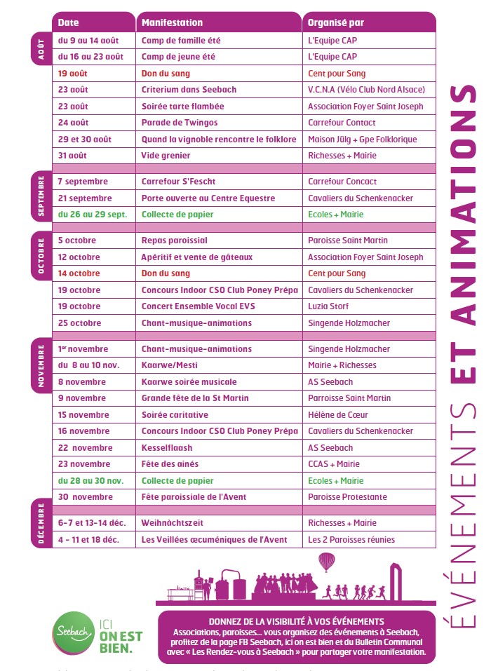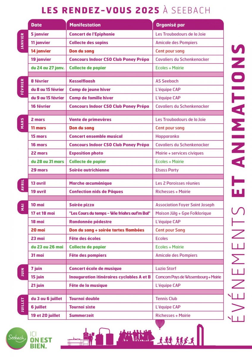 Suggéré par mairiedeseebach Temps de lecture : 1 min Retrouvez les principaux événements et animations qui se tiendront à Seebach tout au long de l’année 2025