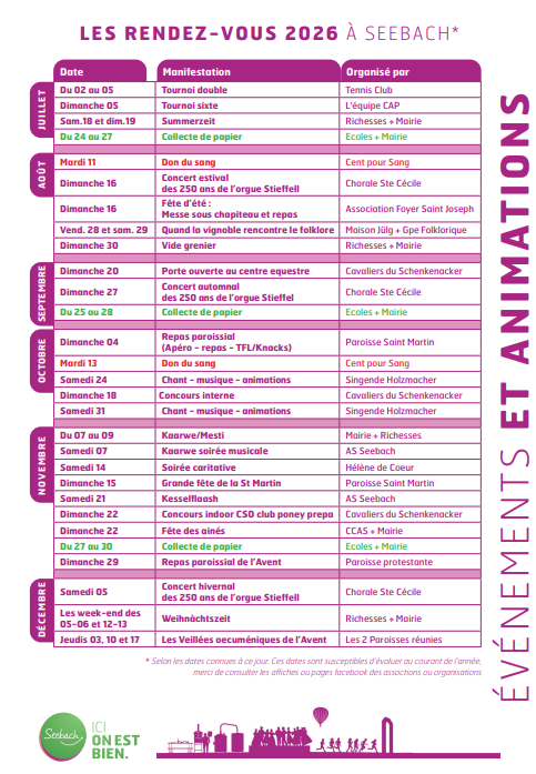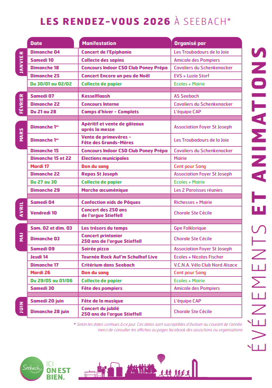 Retrouvez les principaux événements et animations qui se tiendront à Seebach tout au long de l’année 2026 :