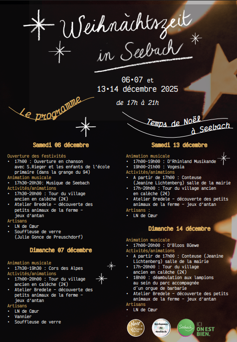Depuis 2021, la fête dite «Weihnàchtszeit in Seebach», les 2ième et 3ième week-end de l’Avent, est aussi une invitation à se retrouver pour partager l’ambiance de Noël au cœur du village.